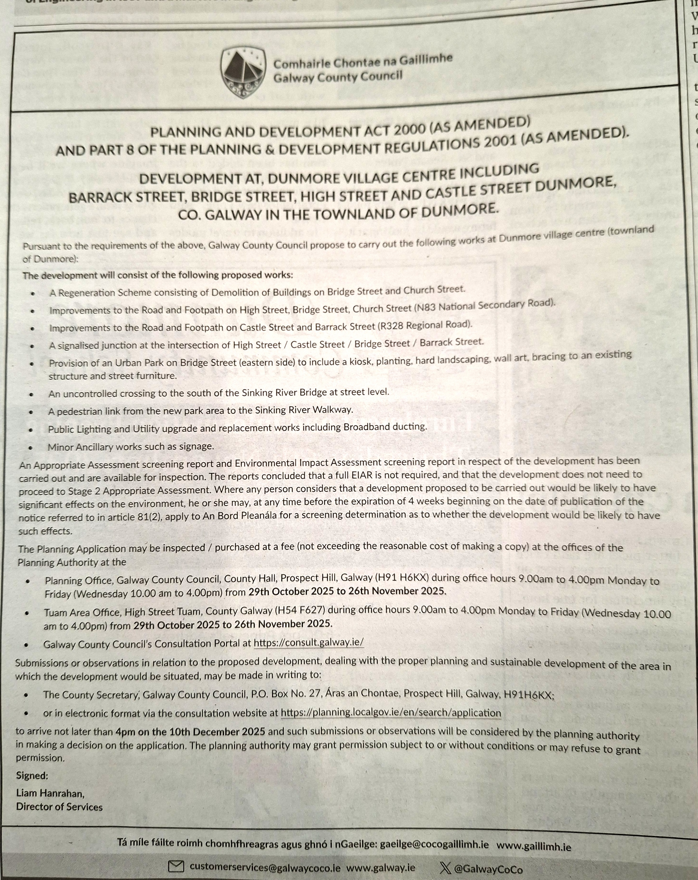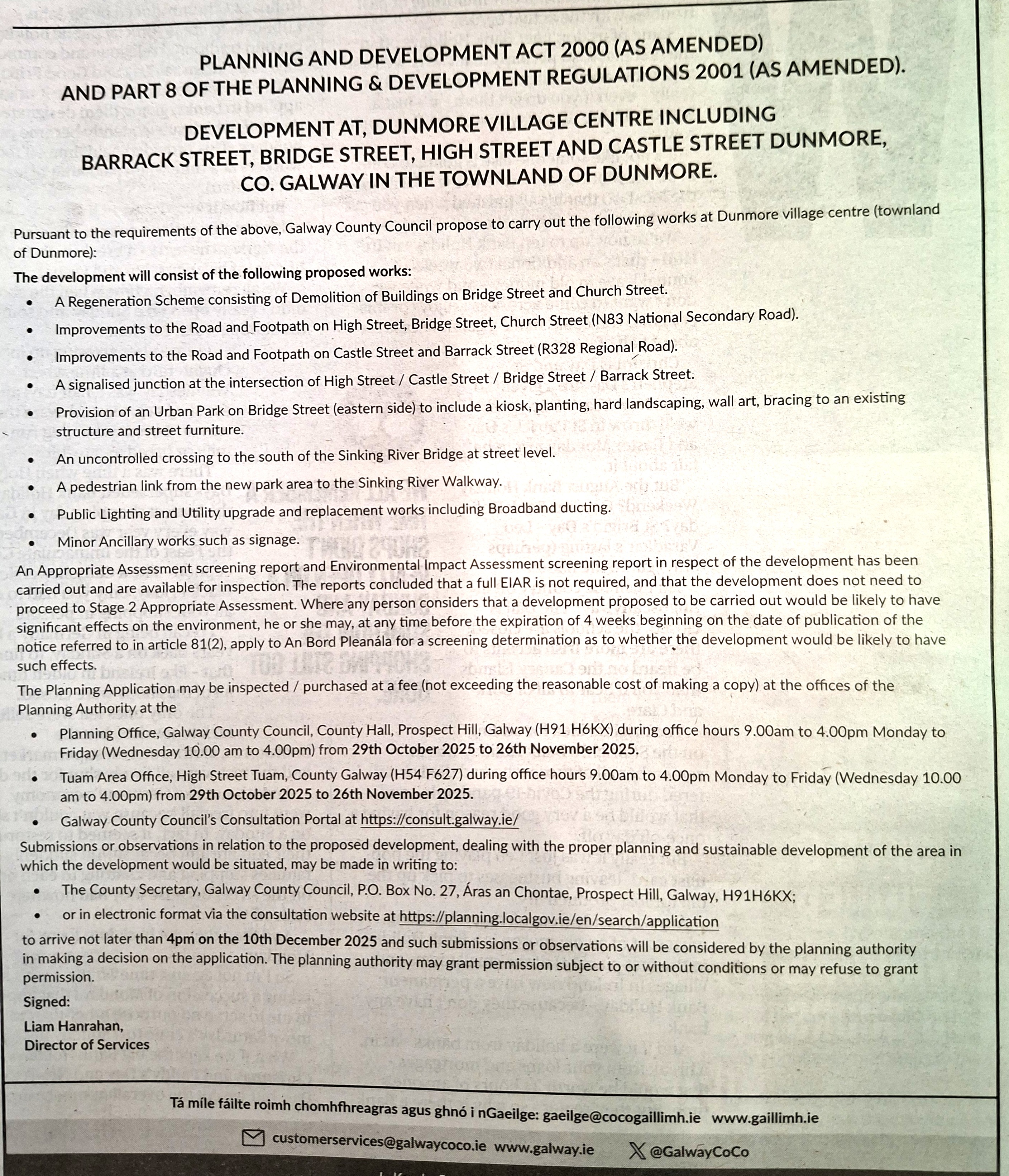 Pursuant to the requirements of the above, Galway County Council propose to carry out the following works at Dunmore village centre (townland of Dunmore):