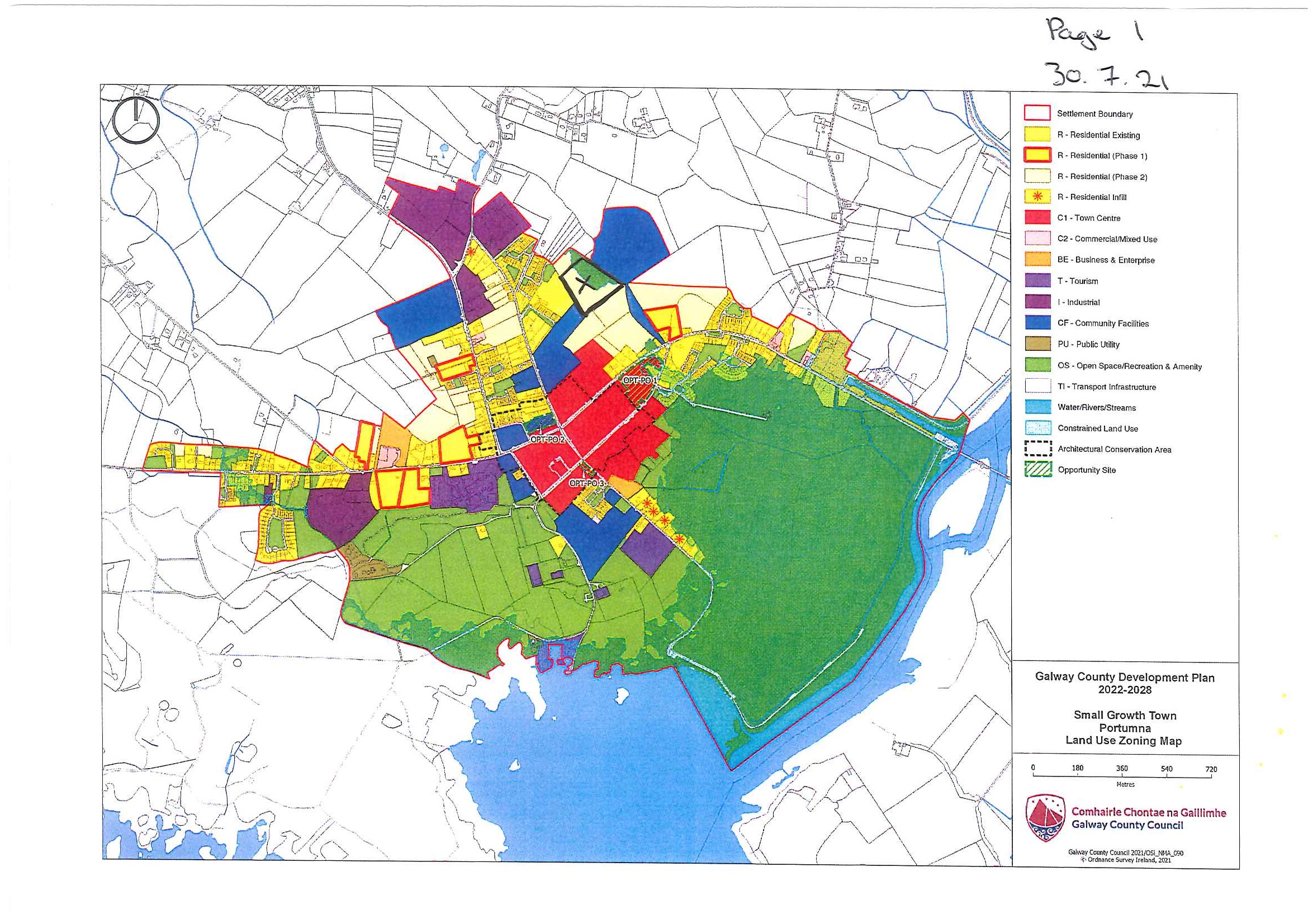 I proposed the area highlighted in attachment page 1 and marked ‘X’ be zoned as CF (community facilities) instead of R2. This area is owned by the Department of Education (Portumna Community School under the trusteeship of GRETB and the Bishop of Clonfert) and is currently used as the playing fields for Portumna Community School and has been since 1990.